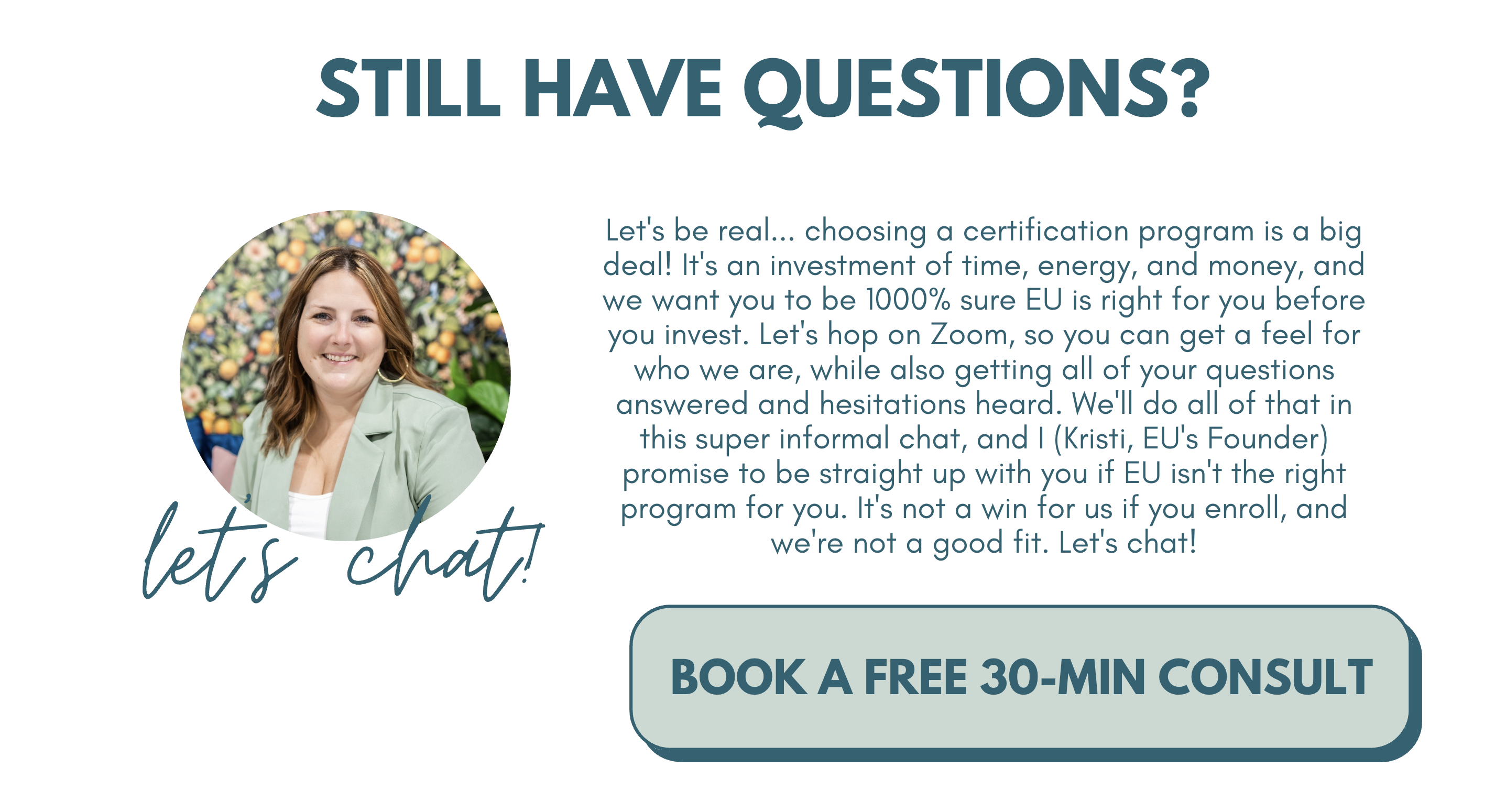 Great question - let me, Kristi, answer this one directly. EU is not an accredited program, and we made that as an intentional decision. A lot of accreditations require extensive training by me and my other instructors that, with respect, I find unnecessary. Under some accreditations, every instructor would be required to do their program of several hundred hours and the courses/coaching we offer would need to be approved. Our Professors range from Bachelor's Degrees to PhDs and have been in coaching roles + owned our own businesses for years. Our team is wildly qualified for this work. We also want the freedom to hire who we find to be qualified and offer the services our students and clients seek. Additionally, and maybe more importantly, I've never had a single client ever ask me who I was accredited by, nor have any of our Professors, nor have our colleagues in the industry. Therefore, we don't feel an accreditation adds value for how it limits us as an organization.